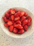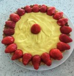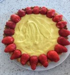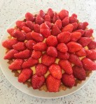 Assemblage du gâteau: Il est impératif que le fond de tarte et la crème pâtissière soient refroidis avant d’assembler le gâteau. Lavez sous l’eau (sans les faire tremper) les fraises, puis équeutez-les (après les avoir lavées et non avant). Coupez-les en deux. Versez la crème pâtissière sur le fond de pâte sablée et répartissez ensuite les fraises harmonieusement sur la tarte (voir photos ci-dessous).