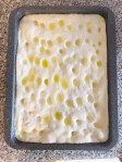 Passé les temps de repos, étalez délicatement avec les mains la pâte sur toute la surface de la plaque, sans oublier les angles. Si la pâte est trop élastique et qu’elle se rétracte, attendez 10 minutes et puis ressayez, vous allez normalement pouvoir l’étaler plus facilement. Salez légèrement et vaporisez d’eau la surface de la fougasse (pour éviter que la pâte sèche pendant la levée). Remettez dans le four éteint pendant 2 heures (2ème pousse).