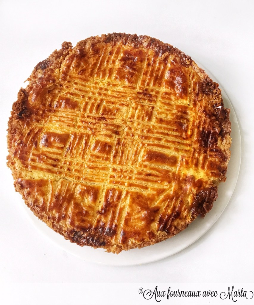 Couvrez avec le reste de la pâte et lissez la surface. Badigeonnez le gâteau avec le jaune d’œuf battu pour qu’il soit bien doré. Dessinez des croisillons à l’aide d’une fourchette. Faites cuire pendant 45 minutes. Laissez refroidir complètement avant de démouler.