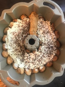 Reprenez le moule du congélateur et versez la crème sur les biscuits. Recouvrez avec une couche de biscuits à la cuillère trempés dans le café. Couvrez avec du film alimentaire et mettez à reposer au congélateur pendant 3 heures.