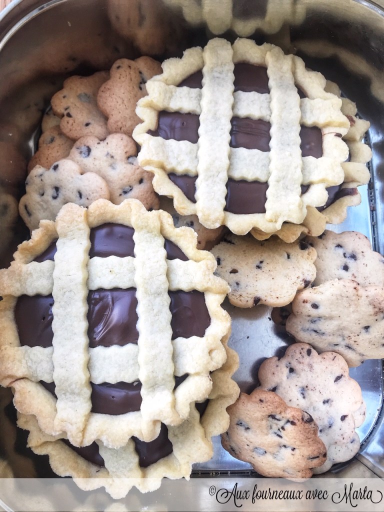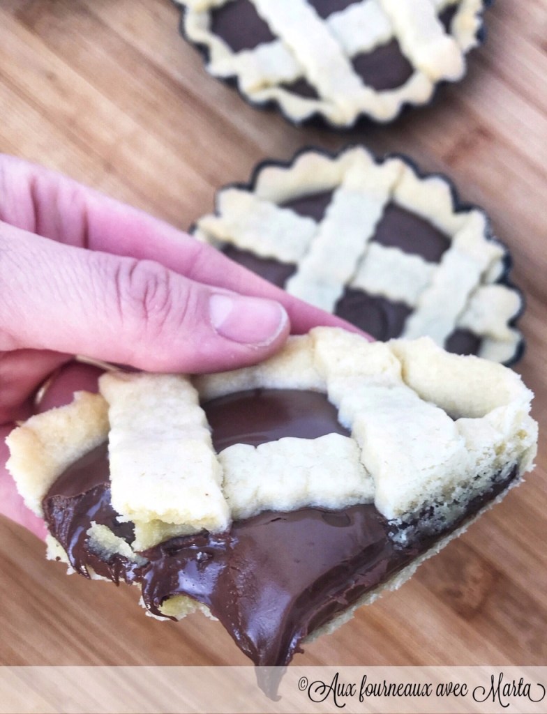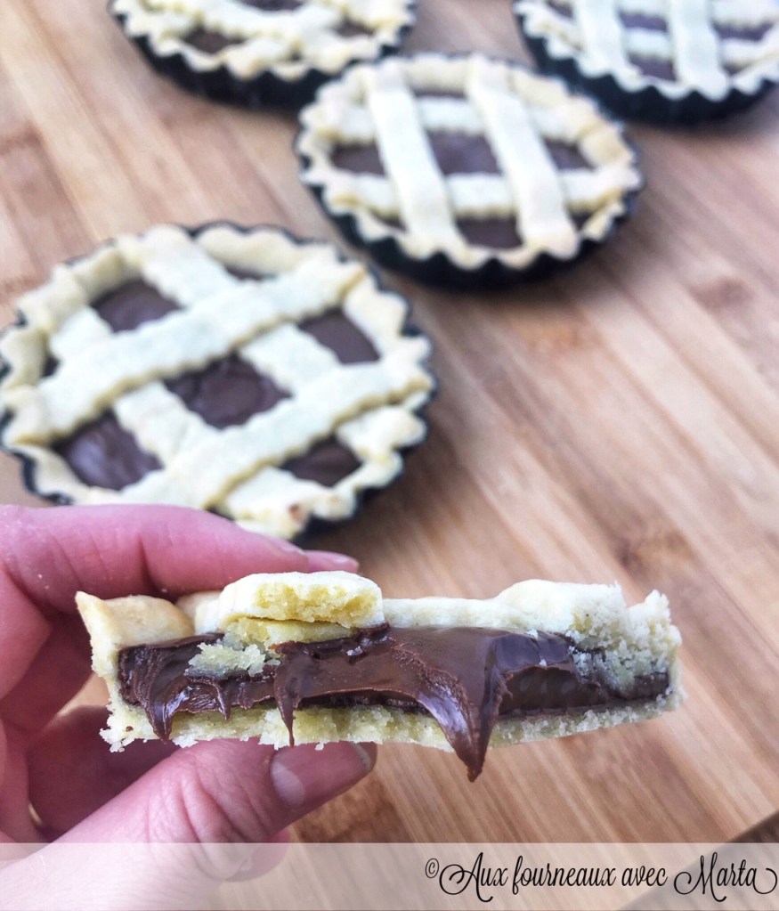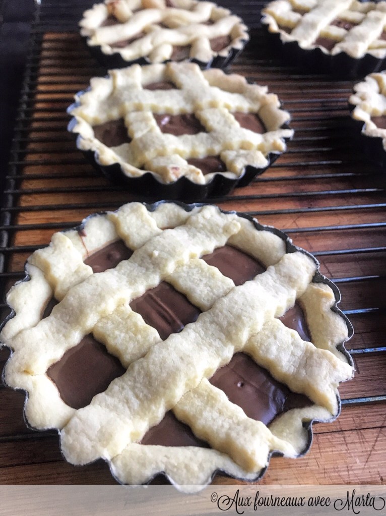 Beurrez et farinez des moules à tartelettes de 12 cm de diamètre. Reprenez la pâte sablée, prélevez-en un peu plus de la moitié et étalez-la à l’aide d’un rouleau pâtissier sur une épaisseur de 5 mm. Chauffez quelques secondes le Nutella au micro-onde pour qu’il soit plus liquide et facile à étaler. Foncez les moules avec la pâte, piquez le fond à la fourchette et versez dans chaque tartelette 2 cuillerées abondantes de pâte à tartiner. Étalez le reste de la pâte sablée et formez des bandes que vous allez disposer en quadrillage sur le Nutella.