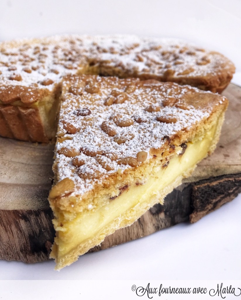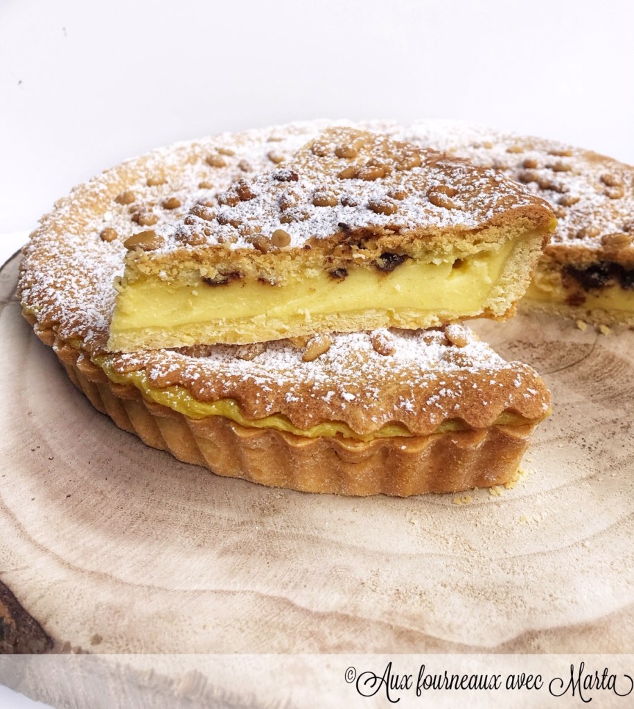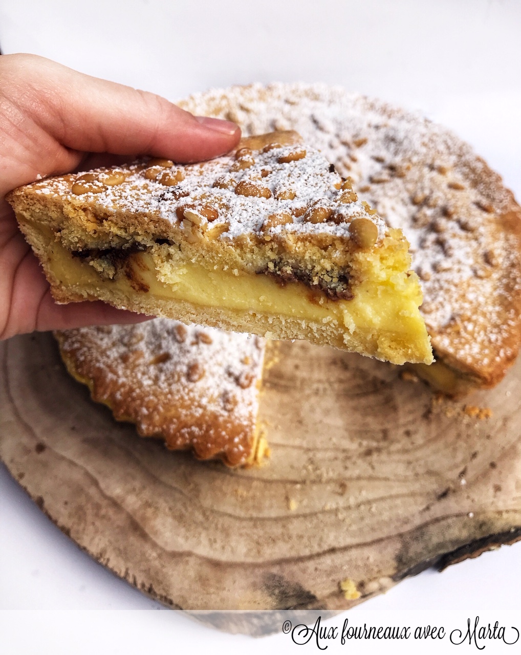 Aujourd’hui j’ai préparé la torta della nonna (tourte de grand-mère) pour le goûter, l’une des tartes incontournables de la cuisine italienne. Elle est constituée d’une pâte sablée garnie de crème pâtissière et recouverte de pâte sablée. Le tout est décoré de pignons de pin et de sucre glace. Un vrai délice, à tel point que je peux affirmer que c’est très probablement ma tarte préférée. Il y a plusieurs variantes à cet irrésistible gâteau: l’une prévoit par exemple l’ajout de pépites de chocolat dans la crème pâtissière (c’est cette version que je vous propose aujourd’hui); une autre « ouverte » prévoit un fond de tarte et une crème pâtissière directement décorée de pignons de pin et le sucre glace. Il ne reste plus qu’à choisir laquelle vous allez préparer aujourd’hui!