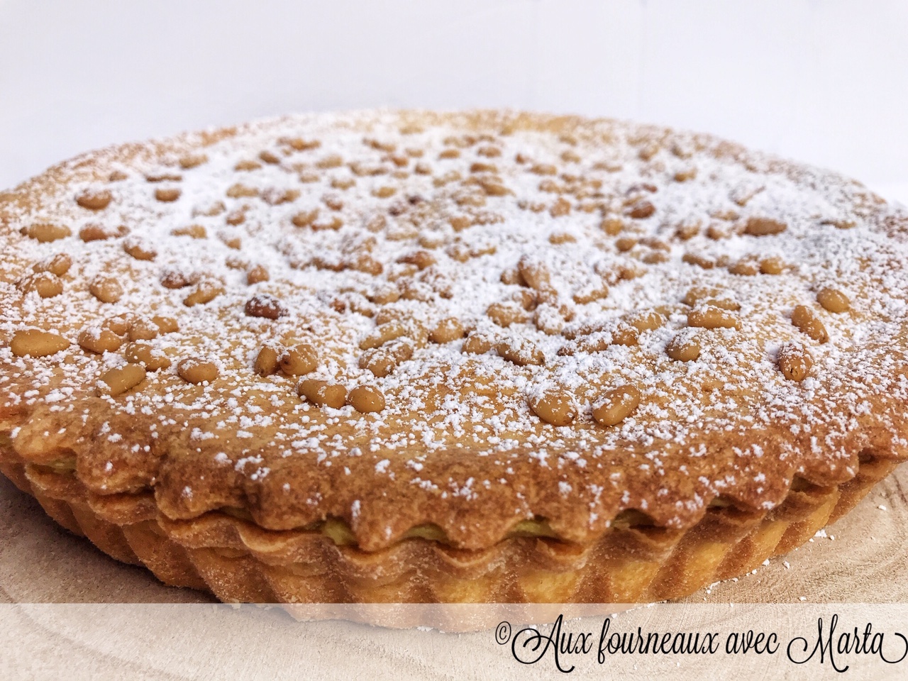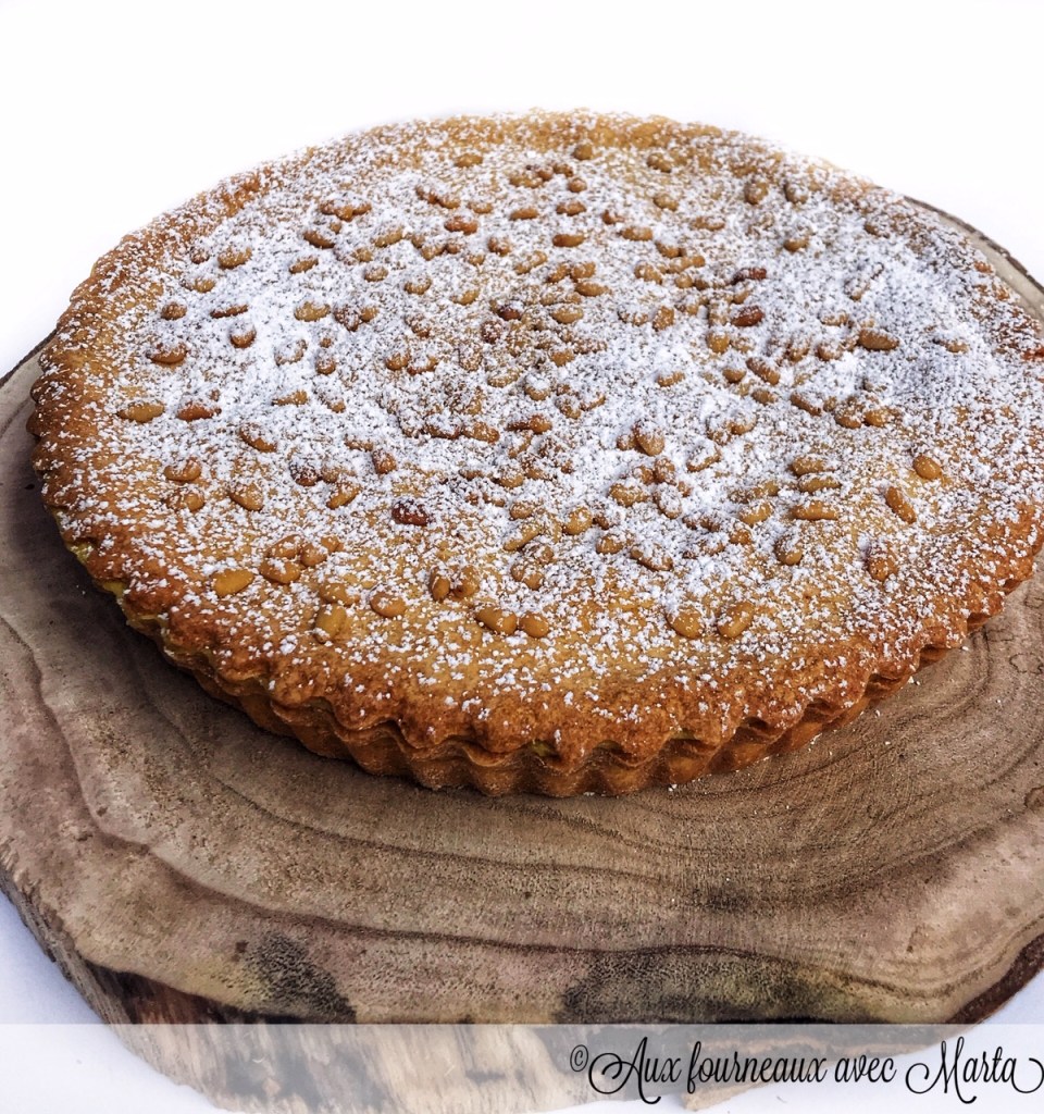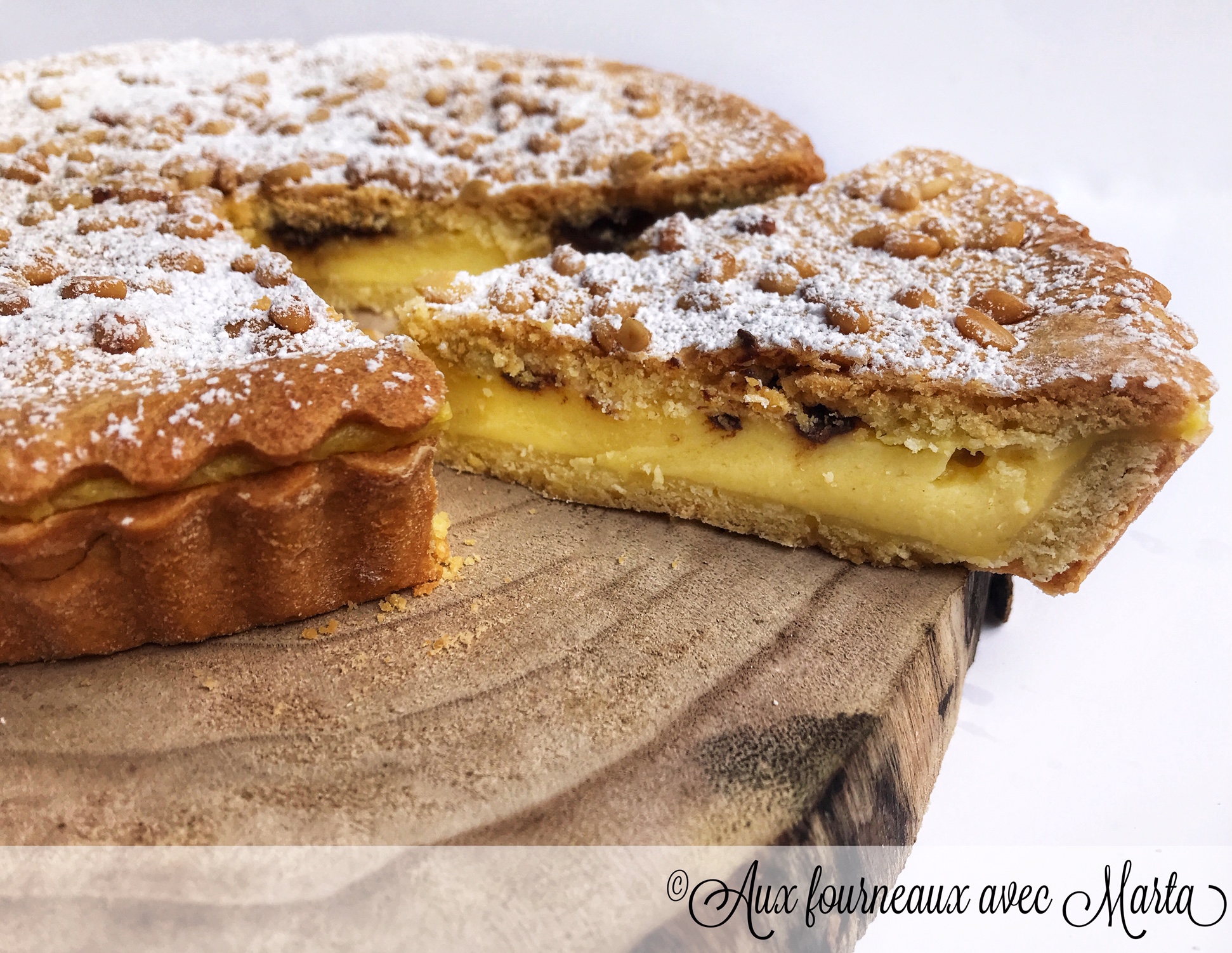 Aujourd’hui j’ai préparé la torta della nonna (tourte de grand-mère) pour le goûter, l’une des tartes incontournables de la cuisine italienne. Elle est constituée d’une pâte sablée garnie de crème pâtissière et recouverte de pâte sablée. Le tout est décoré de pignons de pin et de sucre glace. Un vrai délice, à tel point que je peux affirmer que c’est très probablement ma tarte préférée. Il y a plusieurs variantes à cet irrésistible gâteau: l’une prévoit par exemple l’ajout de pépites de chocolat dans la crème pâtissière (c’est cette version que je vous propose aujourd’hui); une autre « ouverte » prévoit un fond de tarte et une crème pâtissière directement décorée de pignons de pin et le sucre glace. Il ne reste plus qu’à choisir laquelle vous allez préparer aujourd’hui!