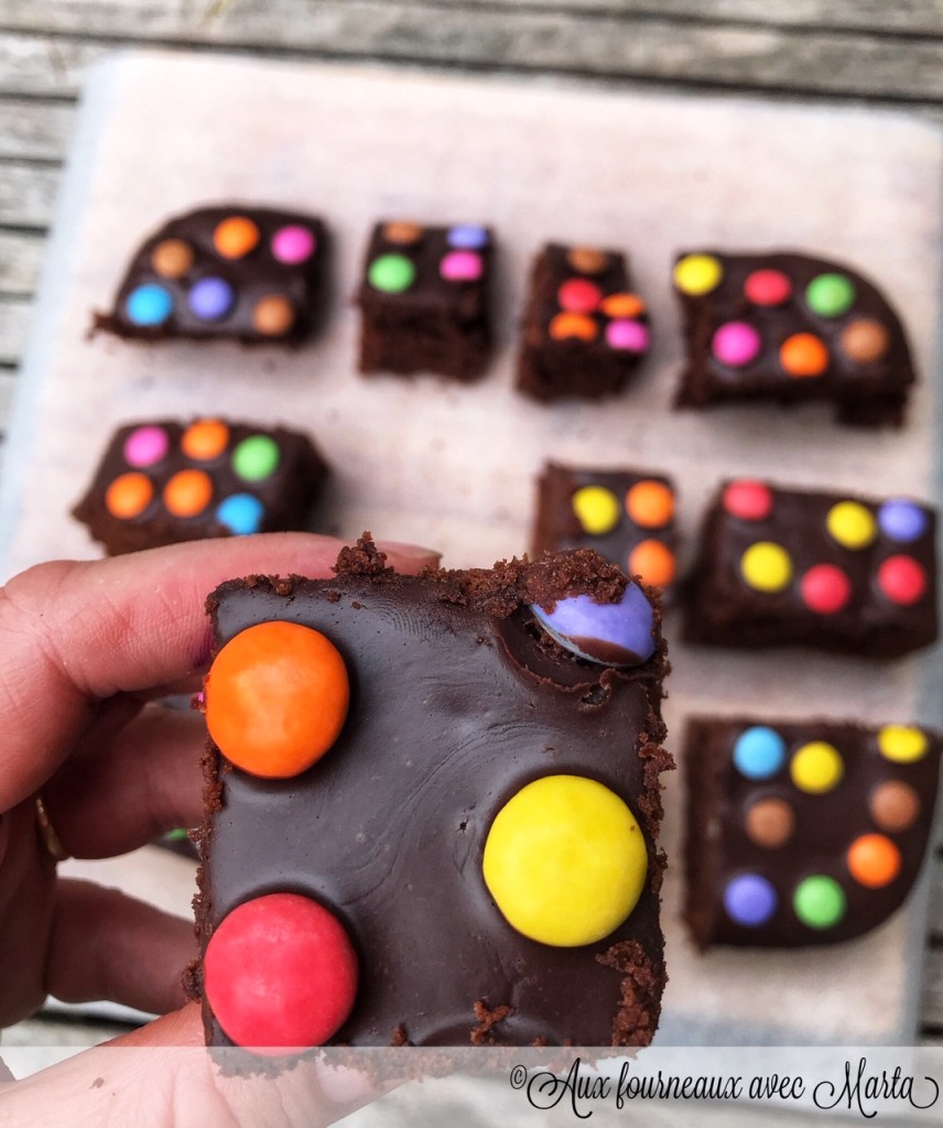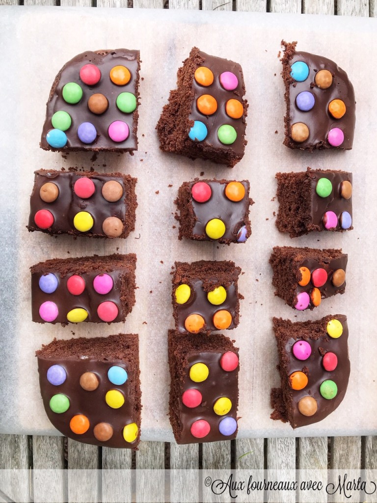 Versez le glaçage sur le gâteau et décorez avec les smarties. Laissez prendre la ganache puis coupez le gâteau en carré avant de servir.