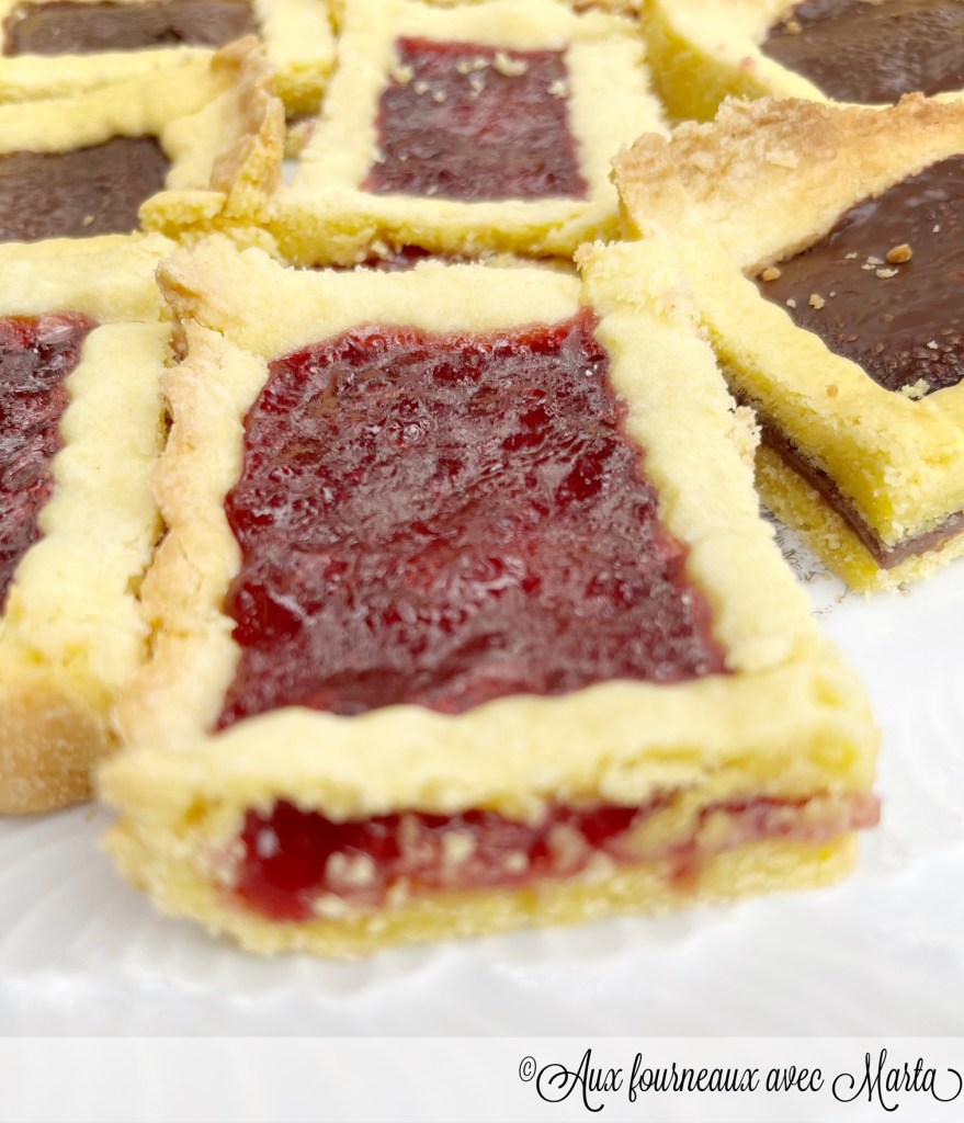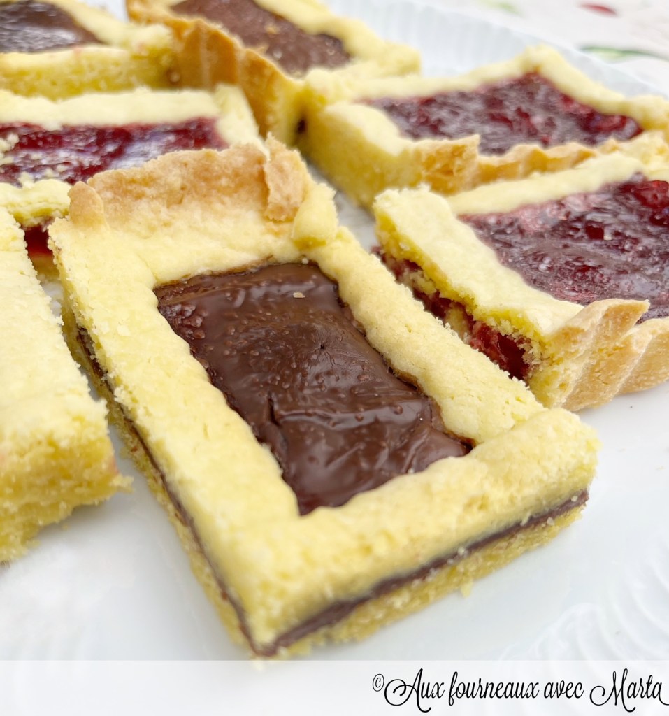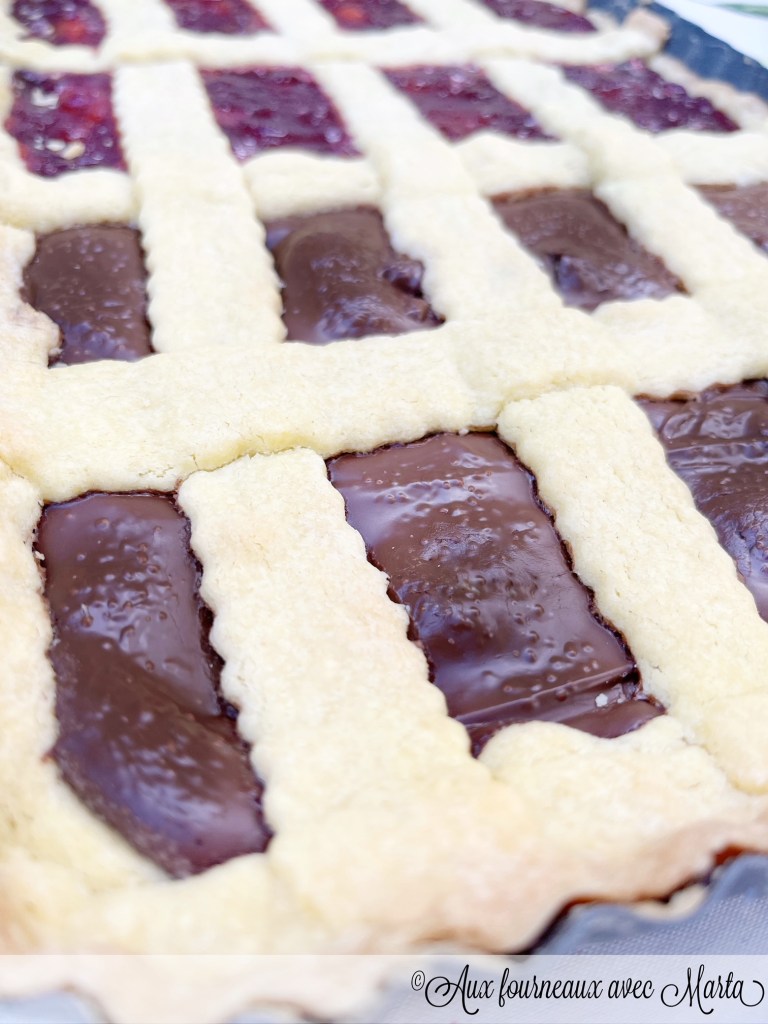 Beurrez et farinez un moule à tarte rectangulaire de 31×21 cm à fond amovible. Reprenez la pâte sablée, prélevez-en les 3/4 et étalez-la à l’aide d’un rouleau pâtissier sur une épaisseur de 5 mm. Foncez le moule avec la pâte et piquez le fond à la fourchette. Formez avec la pâte restante un boudin et placez-le au milieu de manière à diviser la tarte en deux parties (vous pouvez bien évidemment la garnir avec un seul ingrédient si vous préférez). Versez dans une moitié de la tarte du Nutella et dans l’autre moitié de la confiture.  Étalez le reste de la pâte sablée et formez des bandes que vous disposerez en quadrillage sur la garniture.