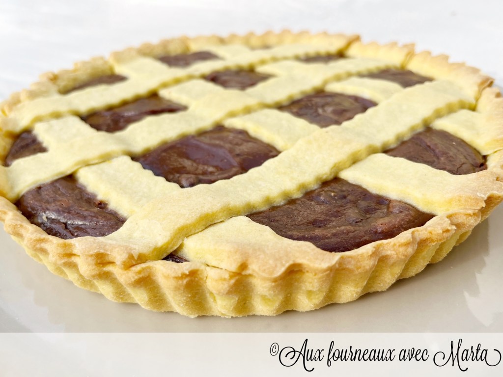 Reprenez la pâte sablée, prélevez-en les 3/4 et étalez-la à l’aide d’un rouleau pâtissier sur une épaisseur de 5 mm. Foncez le moule avec la pâte, piquez le fond à la fourchette et versez la garniture à la ricotta. Étalez le reste de la pâte sablée et formez des bandes que vous allez disposer en quadrillage sur la garniture.