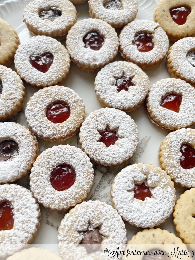 Une fois refroidis, garnissez-les de confiture, en étalant une cuillère à café de confiture sur un biscuit sans trou et en le refermant avec un biscuit troué.