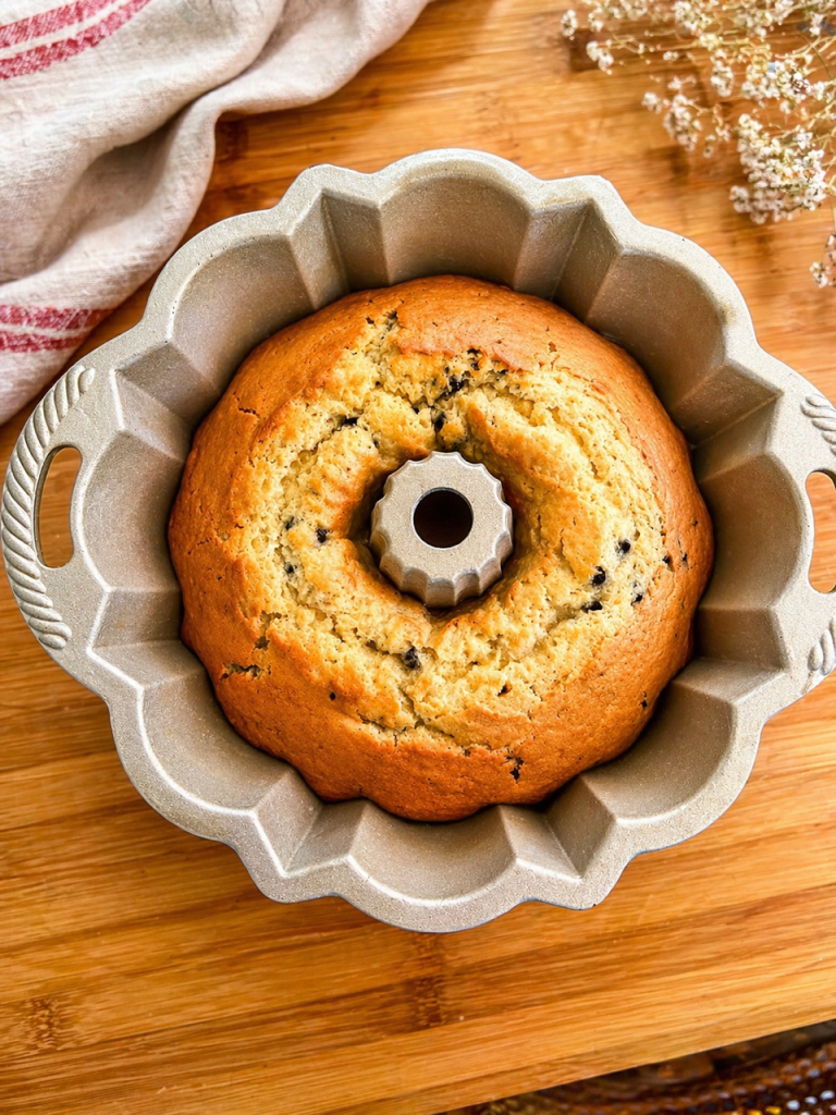 Préchauffez le four à 180°C en modalité chaleur statique. Beurrez et farinez un moule à cheminée de 25 cm de diamètre. Personnellement, j’utilise un moule Nordic Ware : je le trouve idéal pour obtenir une cuisson homogène et un gâteau bien doré sur toute sa surface.
